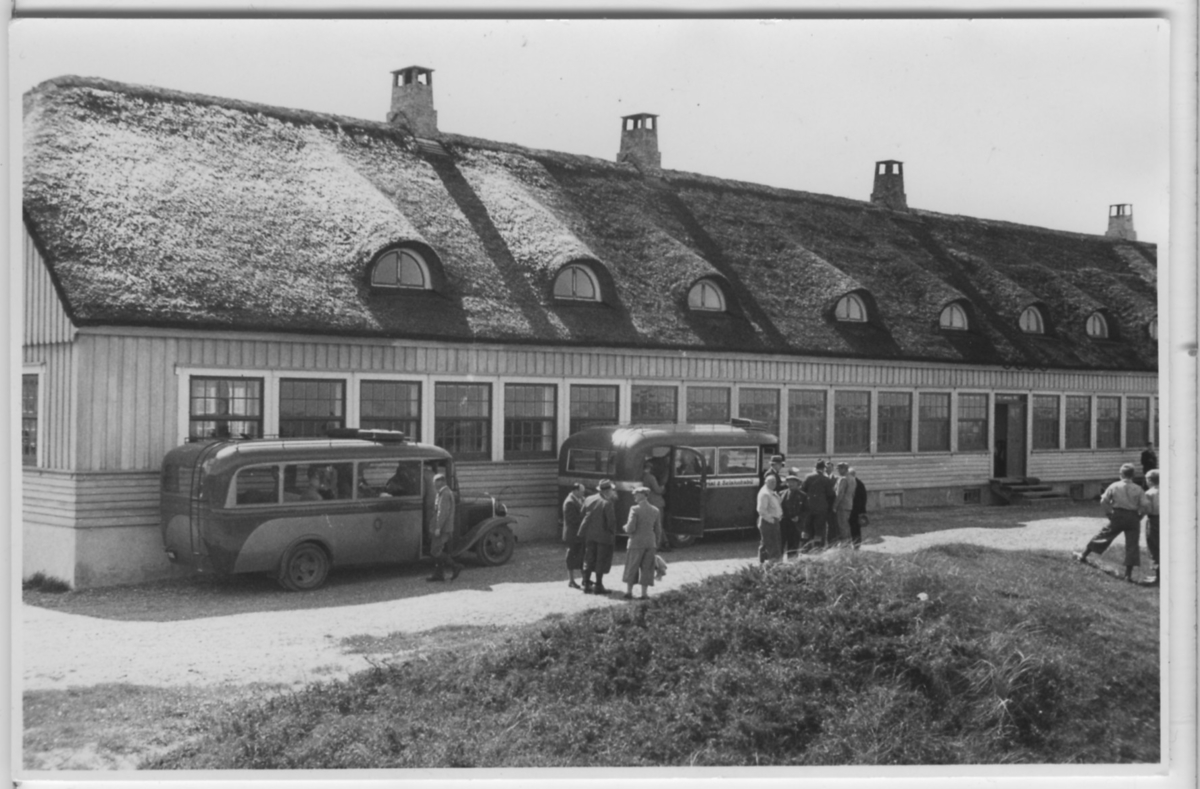 'Biologiska föreningens utfärd till Nordjylland: :: :: Svinklöv Bad Hotell, 2 bussar och delar av gruppen utanför. :: :: Ingår i serie med fotonr. 3824-3859.'