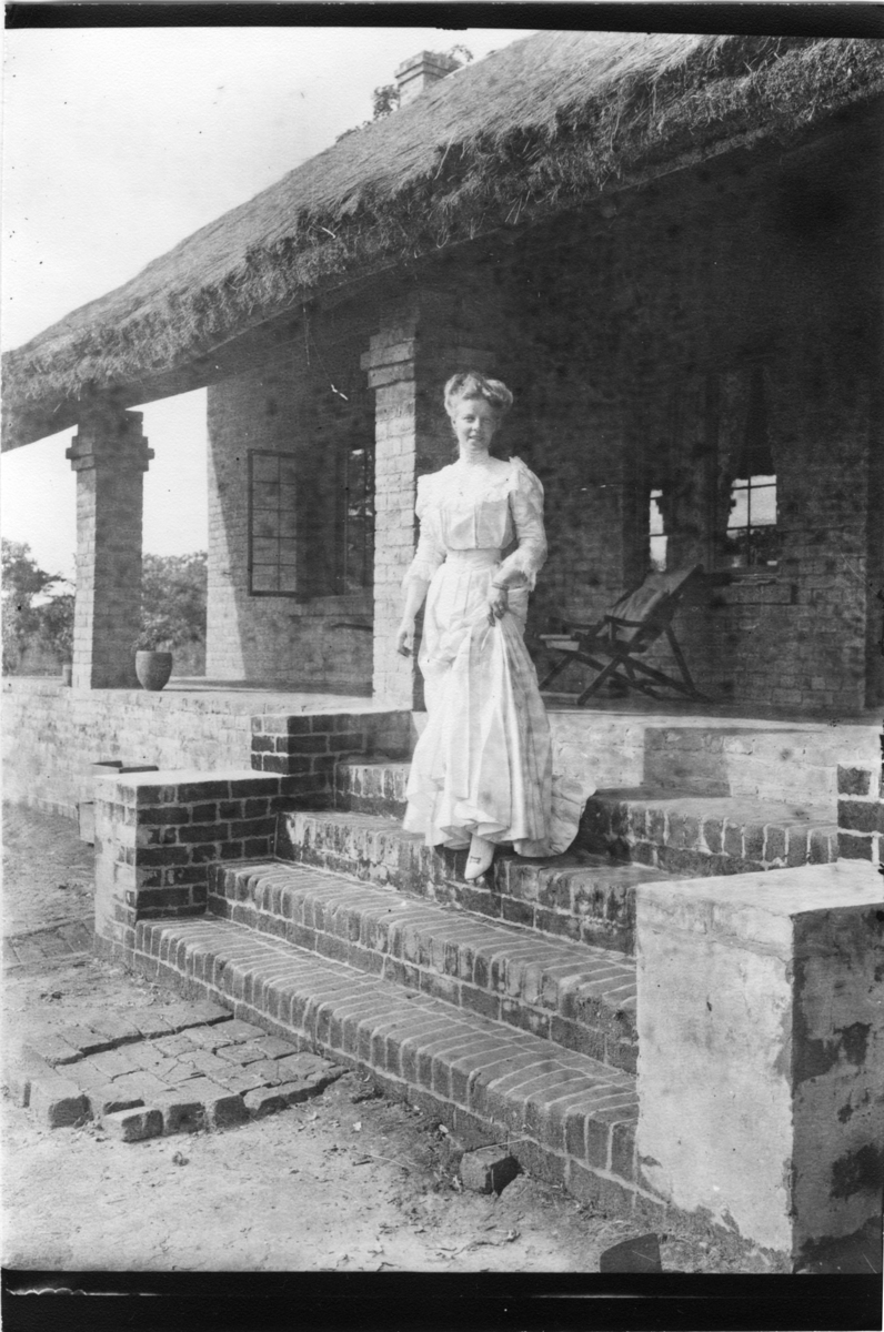 'Diverse fotografier från bl.a. dåvarande Nordrhodesia, nu Zambia, tagna av Konsul Magnus Leijer. :: :: En kvinna stående i trappan upp till verandan kring ett tegelhus, hon ler och tittar in i kameran.'