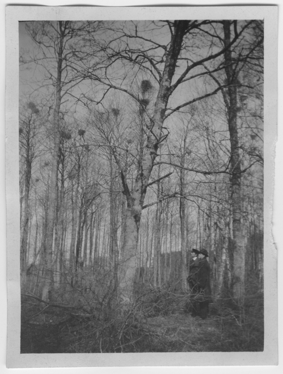 'Råkkoloni vid Onsala prästgård, 2 män står intill björkträd med bon. :: :: Se även fotonr. 692.'