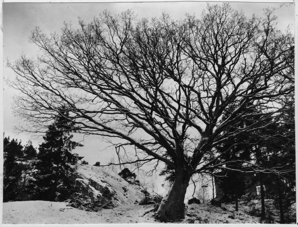 'Bildtext: ''Ek. Stor utgreningsförmåga.'' Närbild på väl förgrenad ek, snötäckt mark. :: :: Fotonr. 7046:293-306 indelade som ''Skogsmarken. Trädens byggnad och livsföreteelser.'' Ingår i serie med fotonr. 7046:1-383, 7047:1-33 och 7048:1-67 med bilder från Länsjägmästare John Lindners bildarkiv.'