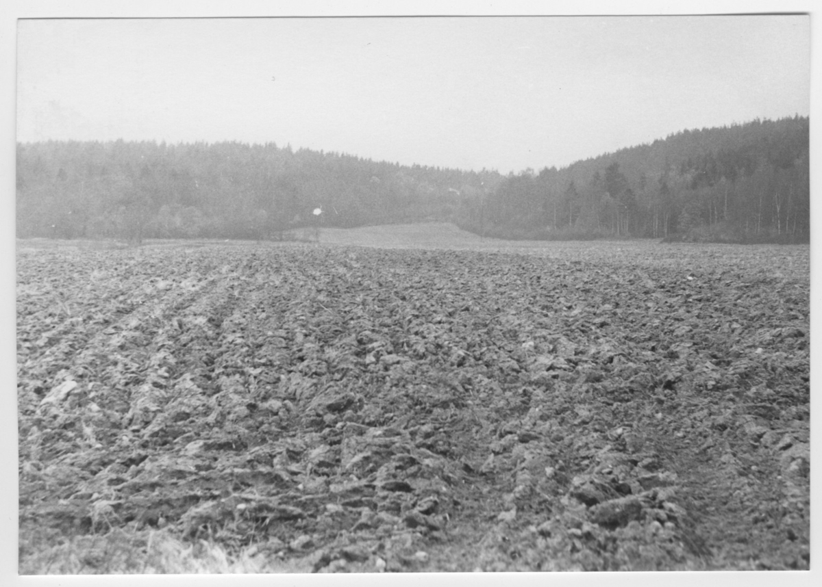 'Bildtext: ''Sedimentyta. Riktning 316.'' :: Vy över öppet fält, åkermark nedanför trädklädda berg. :: :: Ingår i serie med fotonr. 6970:1-1125, dokumentation av Hisingens naturgeografi, visande landskapsformerna i stora drag och gjord inför exploateringen av området. Platserna för fotograferingen finns utsatta på karta i skala 1:4000 som finns på Göteborgs Naturhistoriska musem. Fotoriktningen mättes med kompass i gammalgrader.'