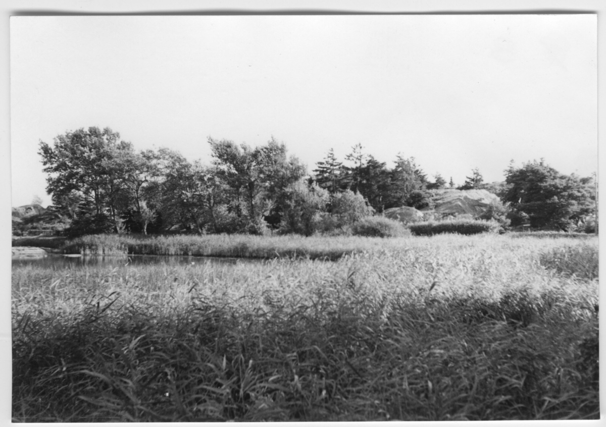 'Bildtext: ''Uppgrundad vassvik med vassvegetation. Riktning 180.'' Igenväxning, lövträdsbestånd. :: :: Ingår i serie med fotonr. 6970:1-1125, dokumentation av Hisingens naturgeografi, visande landskapsformerna i stora drag och gjord inför exploateringen av området. Platserna för fotograferingen finns utsatta på karta i skala 1:4000 som finns på Göteborgs Naturhistoriska musem. Fotoriktningen mättes med kompass i gammalgrader.'