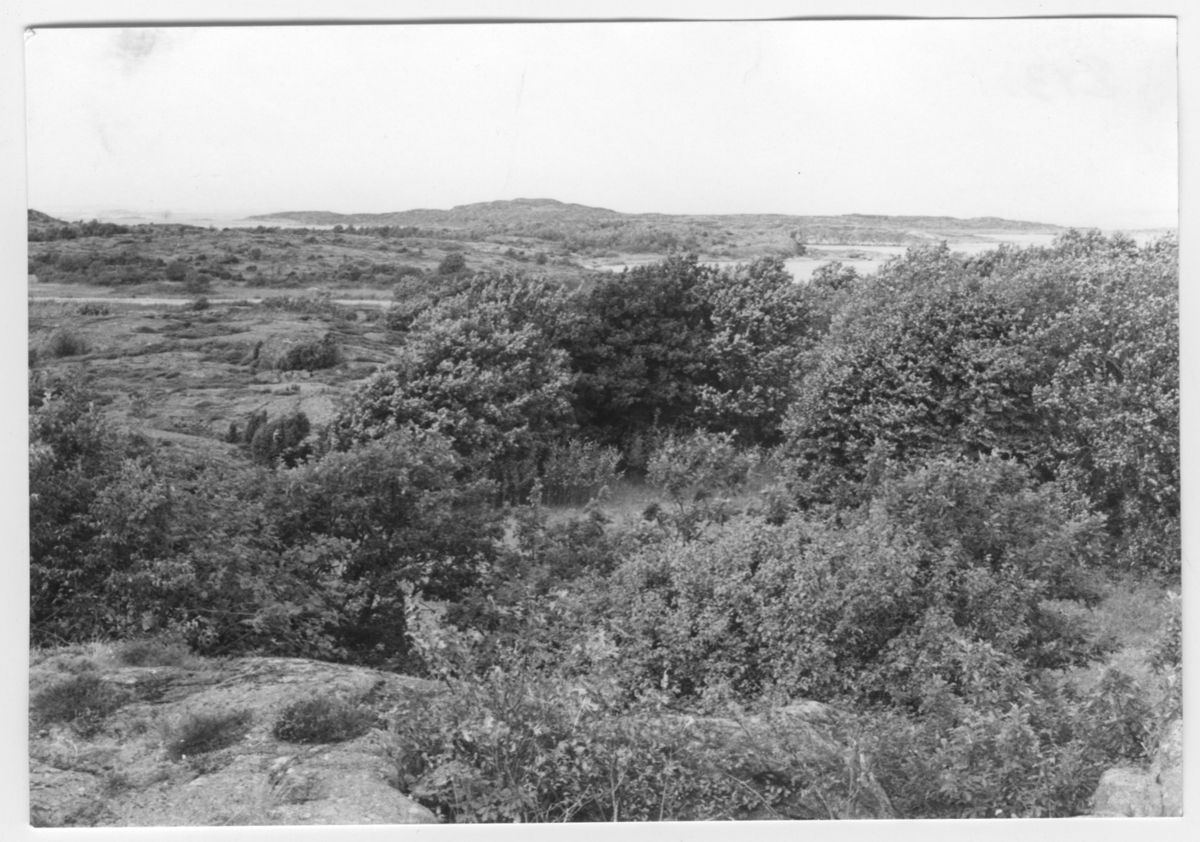 'Bildtext: ''Hällparti med skog i skreva. Riktning 300.'' :: Vy med i förgrunden löv och barrträd i en skreva i berget, i bakgrunden havet och berghällar. :: :: Ingår i serie med fotonr. 6970:1-1125, dokumentation av Hisingens naturgeografi, visande landskapsformerna i stora drag och gjord inför exploateringen av området. Platserna för fotograferingen finns utsatta på karta i skala 1:4000 som finns på Göteborgs Naturhistoriska musem. Fotoriktningen mättes med kompass i gammalgrader.'