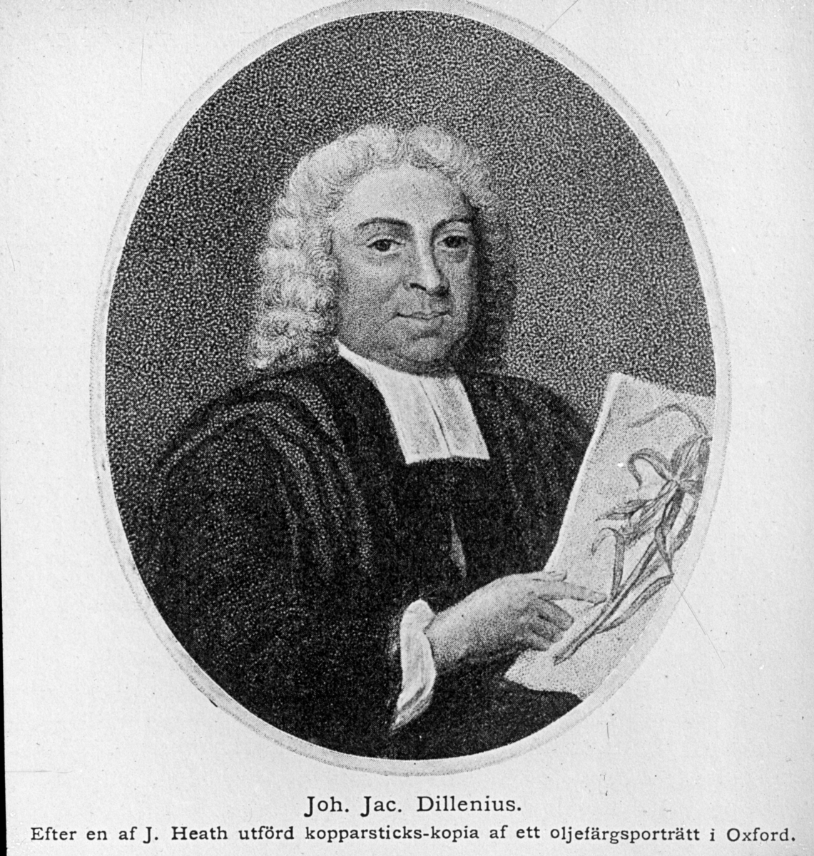 'Johann Jakob Dillenius. Efter en av J. Heath utförd kopparsticks-kopia av ett oljefärgsporträtt i Oxford. :: :: Ingår i fotonr. 5305:1-50 med Leonard Axel Jägerskiölds föredragsbilder om ''Linnés resor och berömda män'' (Arkivnr.1).'