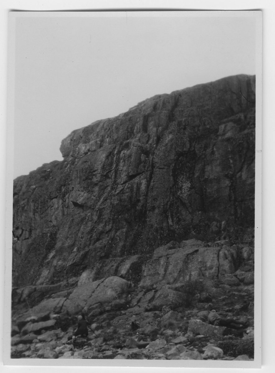 'Korp, bo i bergbrant. Vy. En person sitter nedanför bergväggen. Se fotonr. 1346-1350. :: :: :: Se serie med fotonr. 1305-1356.'