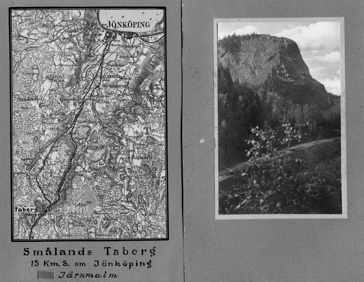 'Vy med berg med järnvägsspår nedanför. :: :: Information enligt arkivdatabasen: ''Bild som troligen föreställer Taberg, Småland, samt karta över området. Inga uppgifter. '''