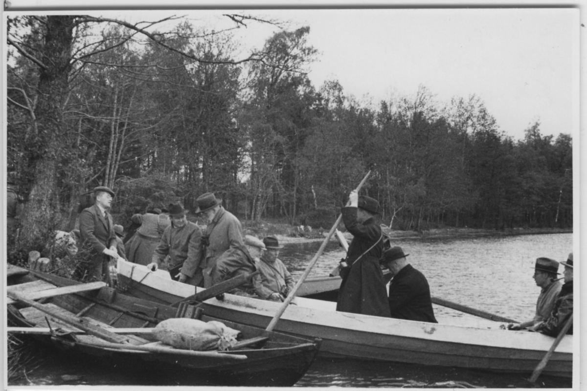 'Biologiska föreningens utfärd till Tåkern, Vadstena m.fl. platser: :: :: Drygt 10 män i och vid 3 ekor invid sjökanten. Gruppen stakar ut med båtarna. I fonden skog intill sjön. :: :: Se fotonr. 3588-3634 samt 3661-3677.'
