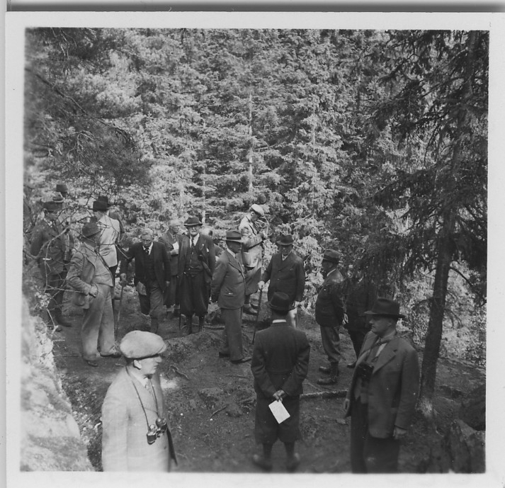 'Biologiska föreningens utfärd till Sveafallen och Villingsbergs kronopark. :: :: Gruppen , ca 20 män, granskog i bakgrunden. Leonard Axel Jägerskiöld sedd rakt framifrån iklädd hatt, käpp och glasögon samt trefjärdedels långa byxor. :: :: Se fotonr. 4226:1-34, 4228:1-3 och 4229:1-3 från samma utfärd.'