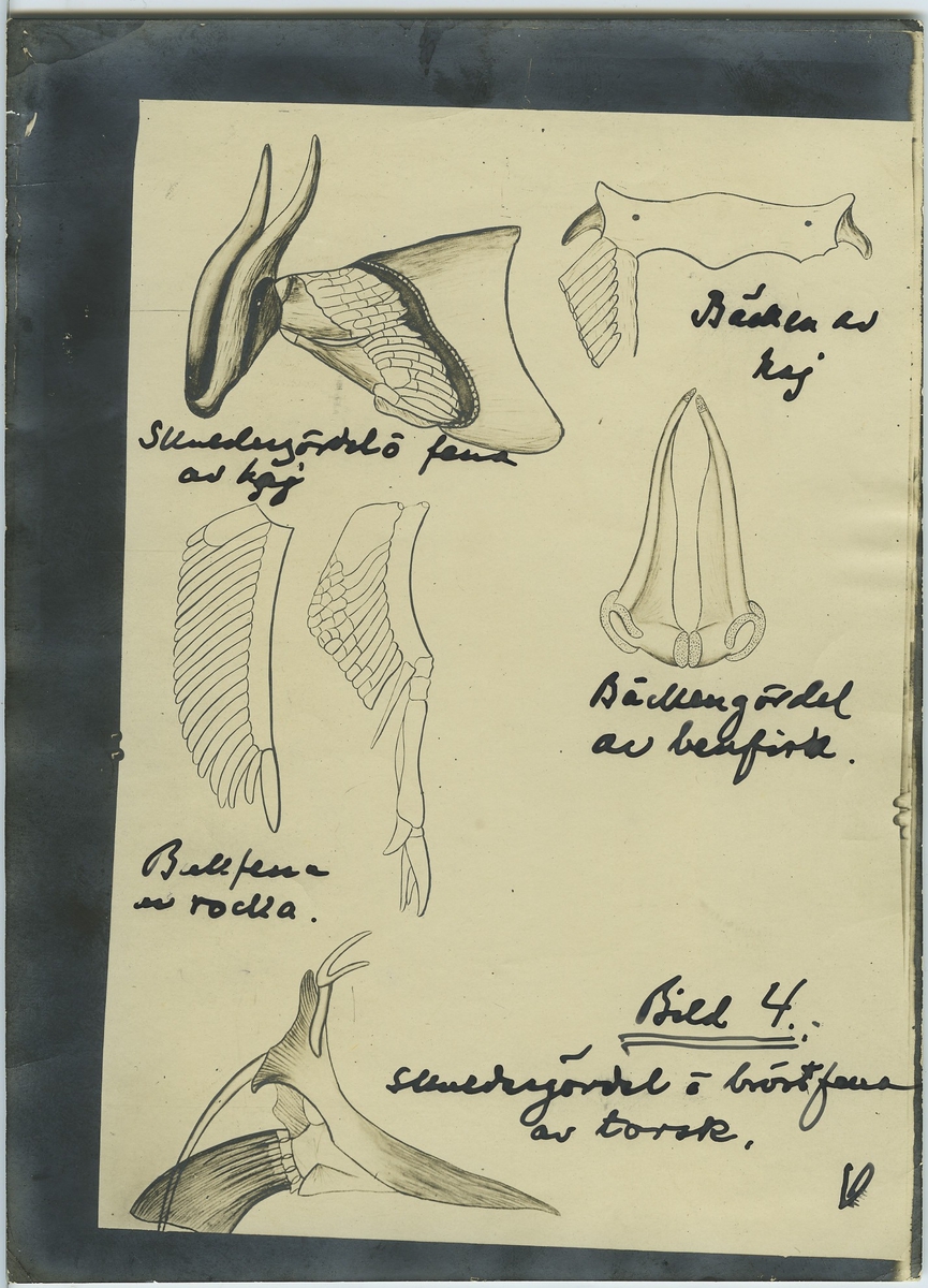 'Teckning av skuldergördel och fena samt bäcken hos haj, bäckengördel hos benfisk, bukfena hos rocka samt skuldergördel och bröstfena hos torsk. :: :: Ett exemplar delvis färglagt. 2 exemplar med handskrivna anteckningar i blyerts och ett med anteckningar i bläck. :: :: ''Fotografier använda vid dissektionskursen våren 1928'' . :: Avfotograferade teckningar på skelett och organ. :: På baksidan av vissa står det Kerstin Nyblén :: V.T.-18 :: ur bok'