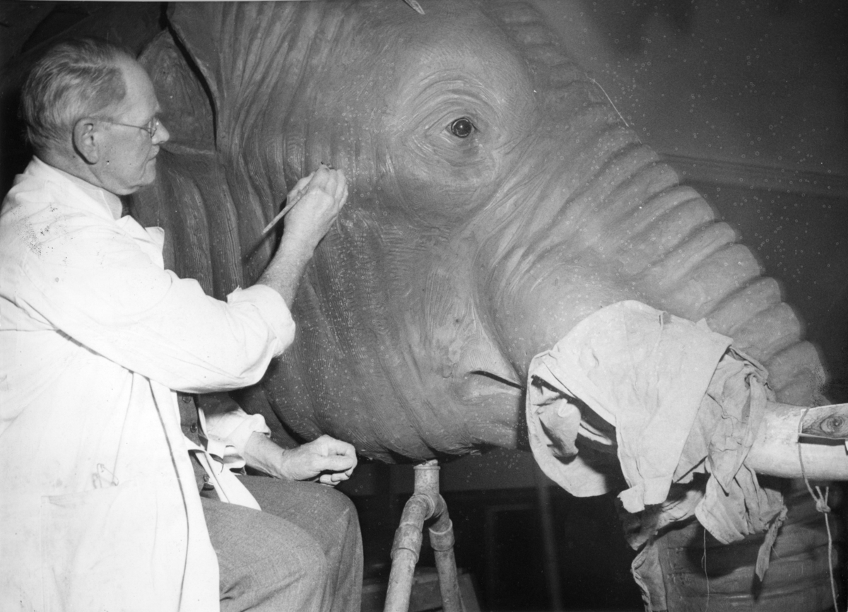 'Monteringen av Göteborgs Naturhistoriska museums elefant, från Angola. :: :: Elefantmontagets lerform finbearbetas av konservator David Sjölander. Närbild på honom sittandes invid elefanthuvudet. :: :: Fynddatum: 1948-12-04. Elefanten skjuten och monterad av David Sjölander. :: :: Elefanten finns utställd på Göteborgs Naturhistoriska Museum i däggdjurssalen. :: :: Ingår i serie med fotonr. 4576:1-18.'