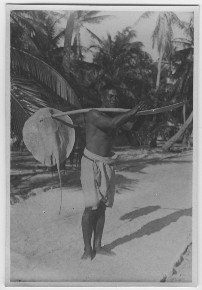 'Bock och Hessle Gilbertöarnaexpeditionen: :: :: 1 man iklädd höftbeklädnad, med käpp spetsande rocka över axeln. Palmer i bakgrunden. :: :: Ingår i serie med fotonr. 6977:1-15.'