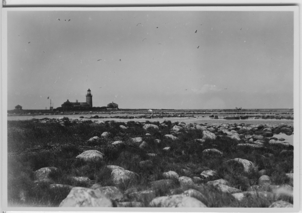 'Biologiska föreningens utfärd till Läsö och Nordre Rönner: :: :: Vy över vik och fyren på Spirholm, på avstånd. Stenblock vis strandkanten och ut i havet. :: :: Se fotonr. 2674-2734, 2687-2691, 2692-2711, 2714-2734, 2843-2863 och 2975 från samma utfärd.'