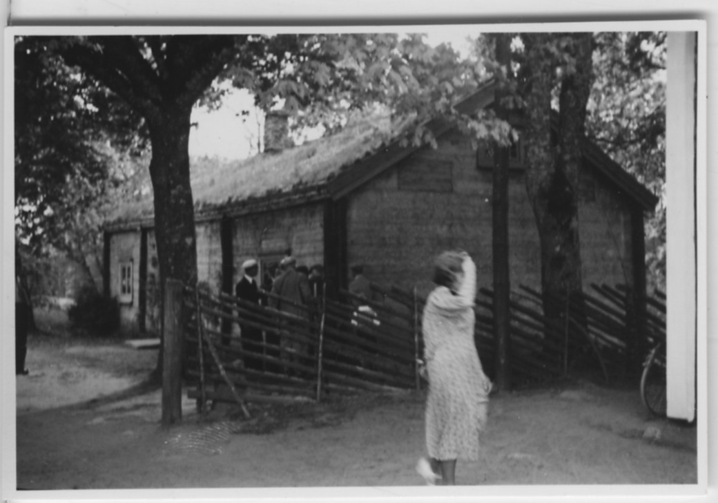 'Biologiska föreningens utfärd till Växjö, Aneboda och Misterhult: :: :: ''Linnés födelsehem Stenbrohult.'' En kvinna framför en trähägnad. I bakgrunden trähus och en grupp män. :: :: Se 3902-3908, 3909-3923 samt 3924-3933 från samma utfärd.'