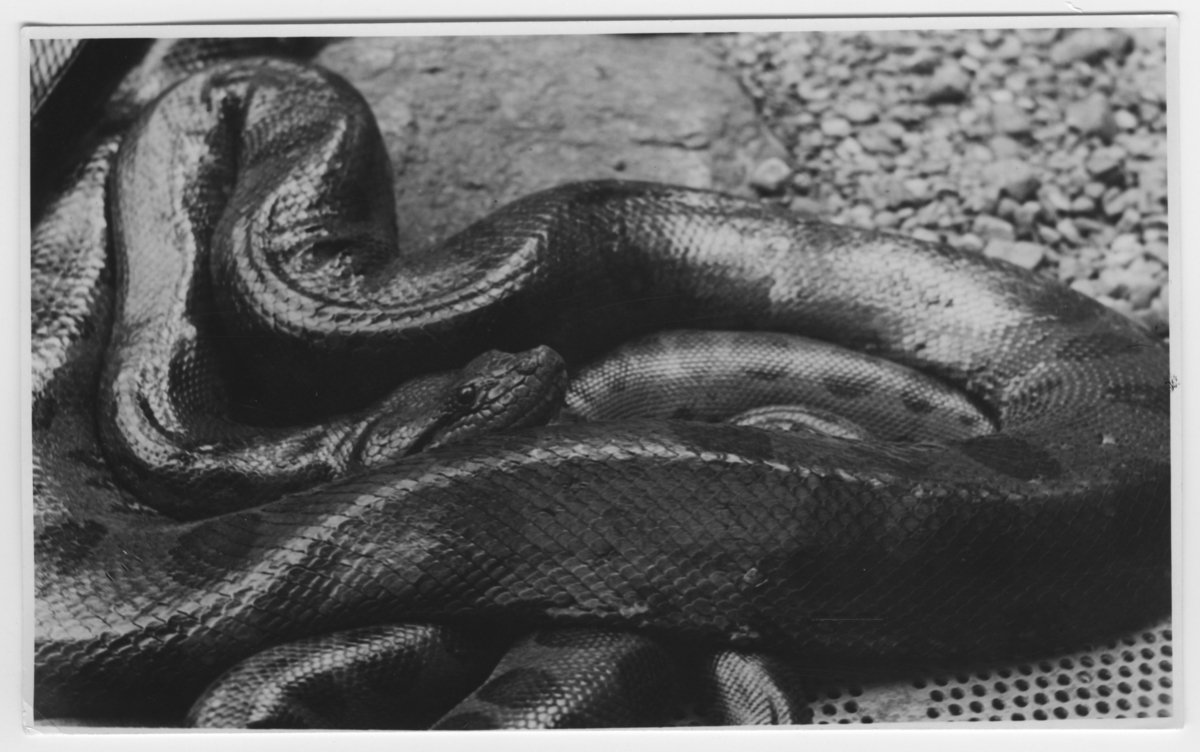'1 st ihopringlad anakonda på marken. Text på tyska på fotot: anakonda, en jätteorm i sydamerika. :: :: Ingår i serie med fotonr. 4501:1-60 ur ingenjör Otto Cyréns ''Ormar i fantasi och verklighet''. Bilden använd på s. 181 i verket.'