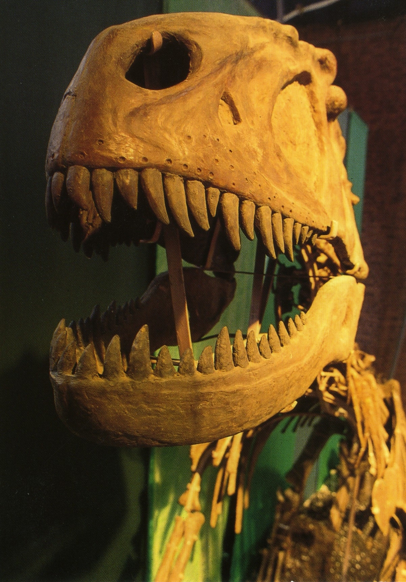'Ingår i en serie med Fotonr. 5419 med Göteborgs Naturhistoriska museums olika vykort genom åren. :: :: Skalle från rovdinosaurie från Yangchuan.'