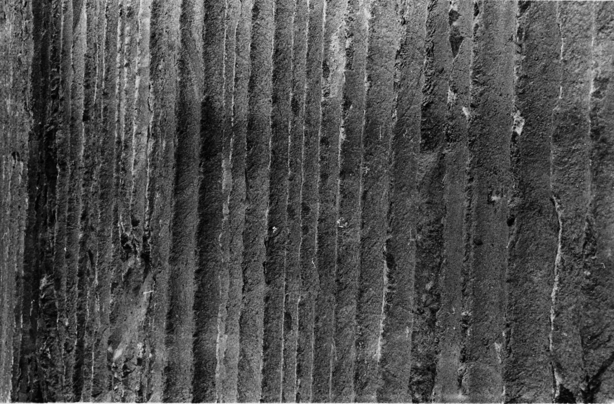 'Tillbyggnaden av Göteborgs Naturhistoriska Museum februari 1979. Södra ytterväggen Göteborgs Naturhistoriska Museum, bergvägg efter sprängning. Närbild av bergväggens struktur efter sprängningen. Sprängd så att fina lodräta räfflor bildats. :: :: Ingår i serie med fotonr. 5527:69-216.'