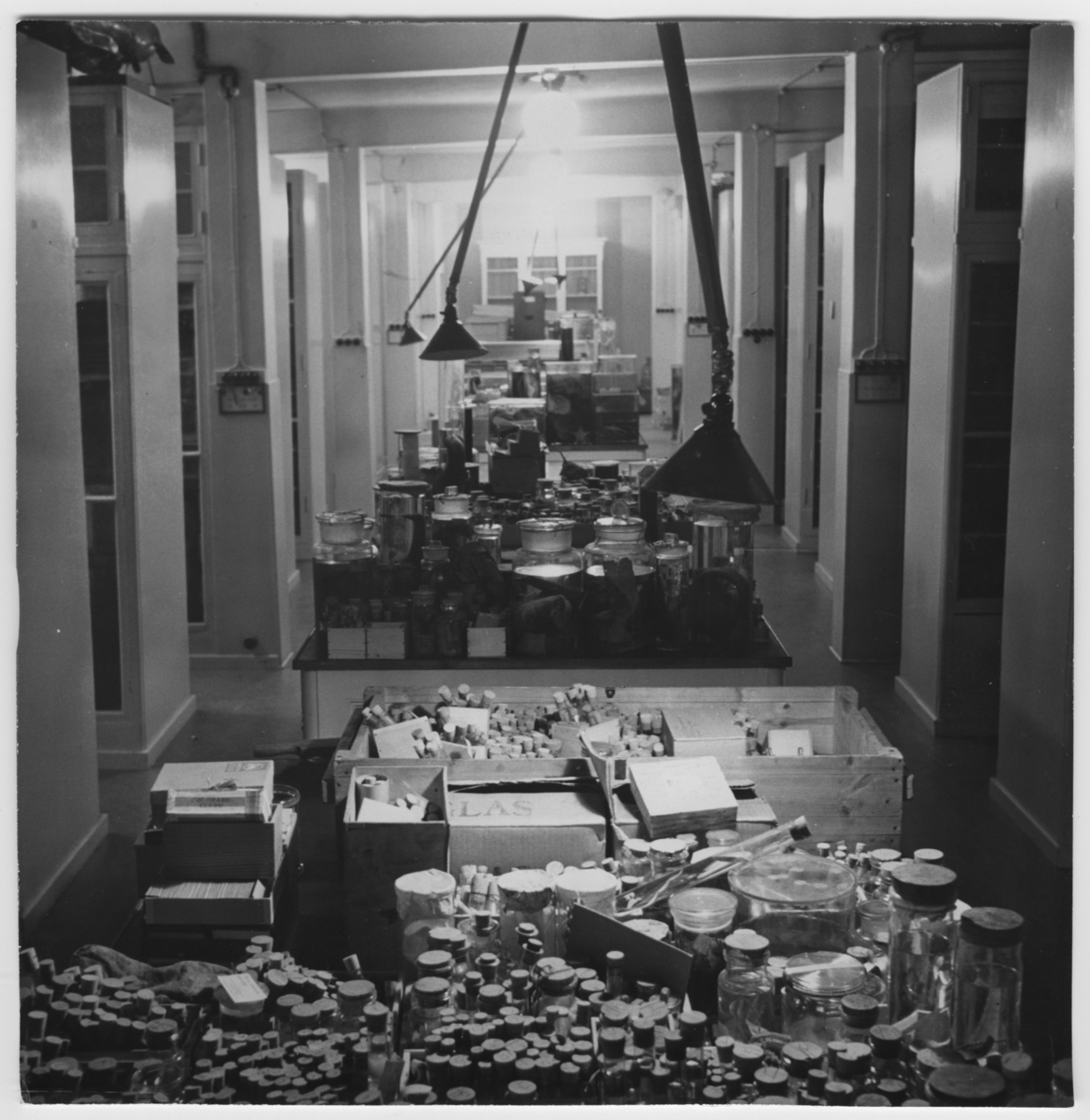 'Vy över spritmagasinet med arbetsbänk i mitten. Diverse korkade glasburkar stående på arbetsbänken. :: Gamla magasinet.'