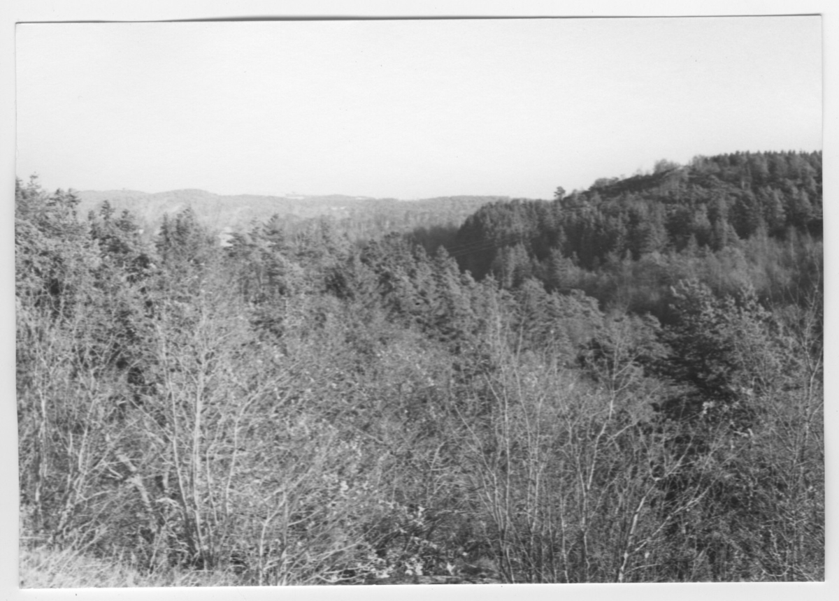 'Bildtext: ''Bergmassiv med skog. Riktning 94.'' :: Vy över trädbevuxna berg, barrträd och lövträd. :: :: Ingår i serie med fotonr. 6970:1-1125, dokumentation av Hisingens naturgeografi, visande landskapsformerna i stora drag och gjord inför exploateringen av området. Platserna för fotograferingen finns utsatta på karta i skala 1:4000 som finns på Göteborgs Naturhistoriska musem. Fotoriktningen mättes med kompass i gammalgrader.'