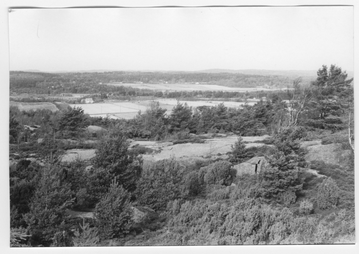 'Bildtext: ''Hällpartier. Riktning 310.'' :: :: Ingår i serie med fotonr. 6970:1-1125, dokumentation av Hisingens naturgeografi, visande landskapsformerna i stora drag och gjord inför exploateringen av området. Platserna för fotograferingen finns utsatta på karta i skala 1:4000 som finns på Göteborgs Naturhistoriska musem. Fotoriktningen mättes med kompass i gammalgrader.'