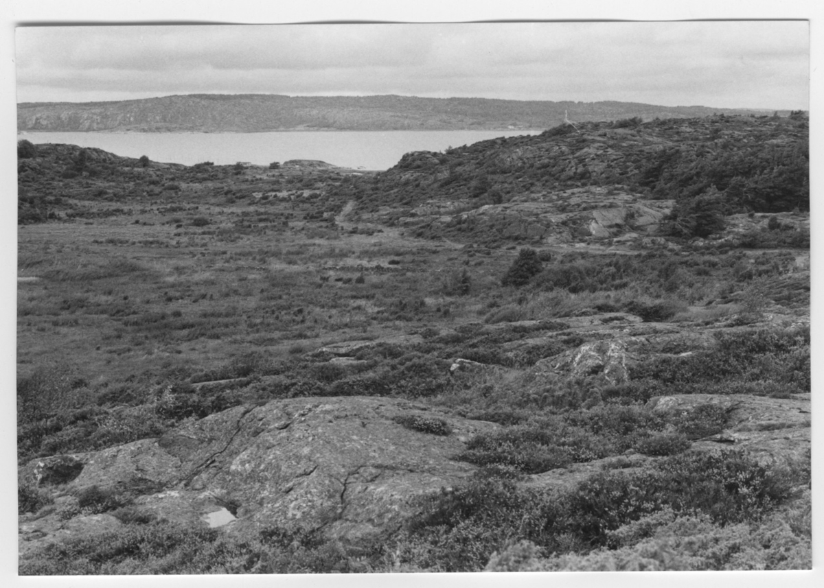 'Bildtext: ''Strandäng. Riktning 356.'' Vy över ljungbevuxna berghällar, i lägre partiet strandäng. Vy ut mot havet och i fonden berghällar. :: :: Ingår i serie med fotonr. 6970:1-1125, dokumentation av Hisingens naturgeografi, visande landskapsformerna i stora drag och gjord inför exploateringen av området. Platserna för fotograferingen finns utsatta på karta i skala 1:4000 som finns på Göteborgs Naturhistoriska musem. Fotoriktningen mättes med kompass i gammalgrader.'