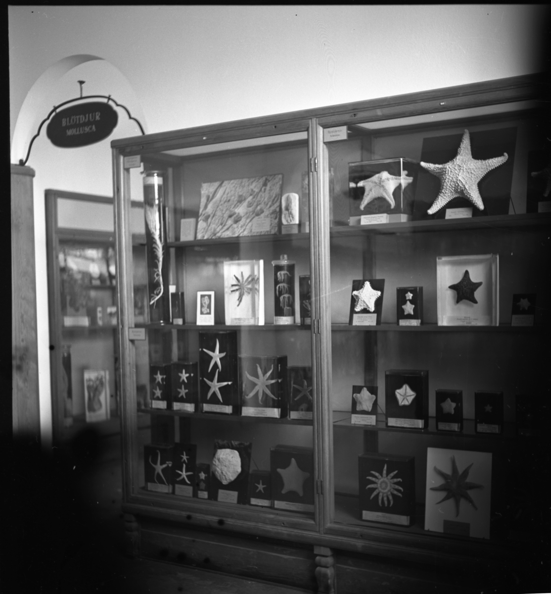 'Monterskåp med diverse preparat i glasbehålllare av sjöstjärnor. På skylt i gången står ''blötdjur (Mollusca)'' som finns bakom väggen. :: :: Ingår i serie med fotonr. 7120 med diverse bilder från Hans Lohmander.'