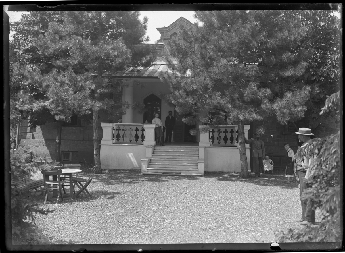 'Vy med trädgård framför ett hus med veranda. Människor, barn, kvinnor och män, på verandan och i trädgården. I trädgården står ett bord och stolar, trädgårdsmöbler. Kläder. Klädsel. :: :: Ingår i serie med fotonr. 5281:1-13. Se även fotonr. 5269-5292 med bilder från Stuxbergs resa till Kaukasien.'