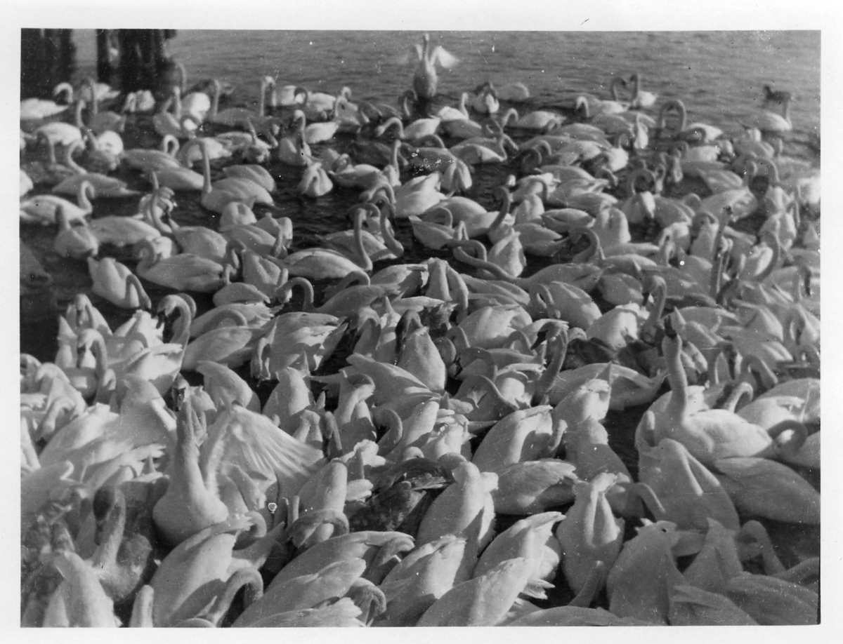 'Övervintrande svanar i Landskrona hamn, en grupp svanar. På det ena exemplaret har motivet rundade hörn. :: :: Se fotonr. 1358-1368, 1430, 2544-2545 samt 945-950, samma motiv samma år.'