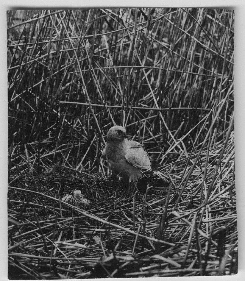 'Blå kärrhök, hane, vid boet med unge i vass. :: :: Se serie med fotonr. 3233-3239.'
