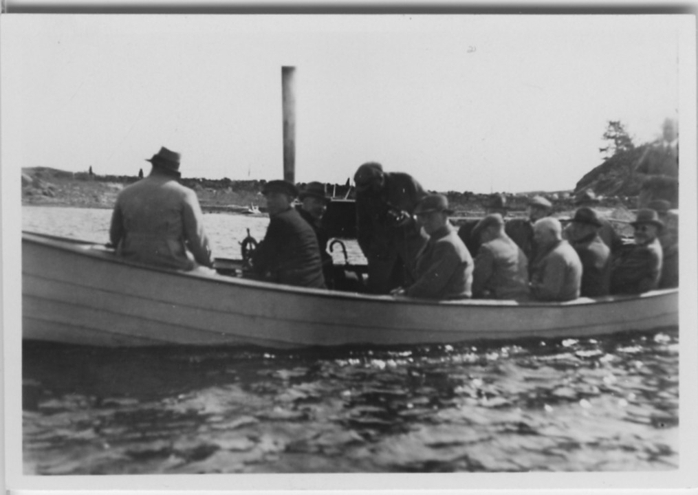 'Biologiska föreningens utfärd till Läckö och Ekens skärgård: :: :: Cirka 12 män i en (motor)båt. Vy med land i fonden. :: :: Se fotonr. 3242-3254, 3255, 3256-3259, 3260-3285 samt 3889-3894.'