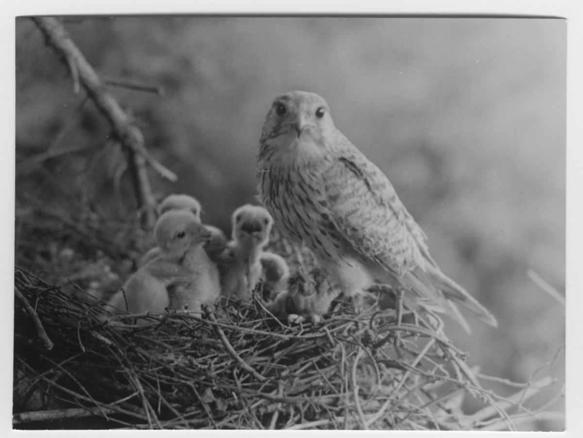 'Tornfalkhona på bokanten, med ca 4 ungar. Närbild. :: :: Ingår i serie med fotonr. 3550-3567. Se särskilt fotonr. 3555-3558.'
