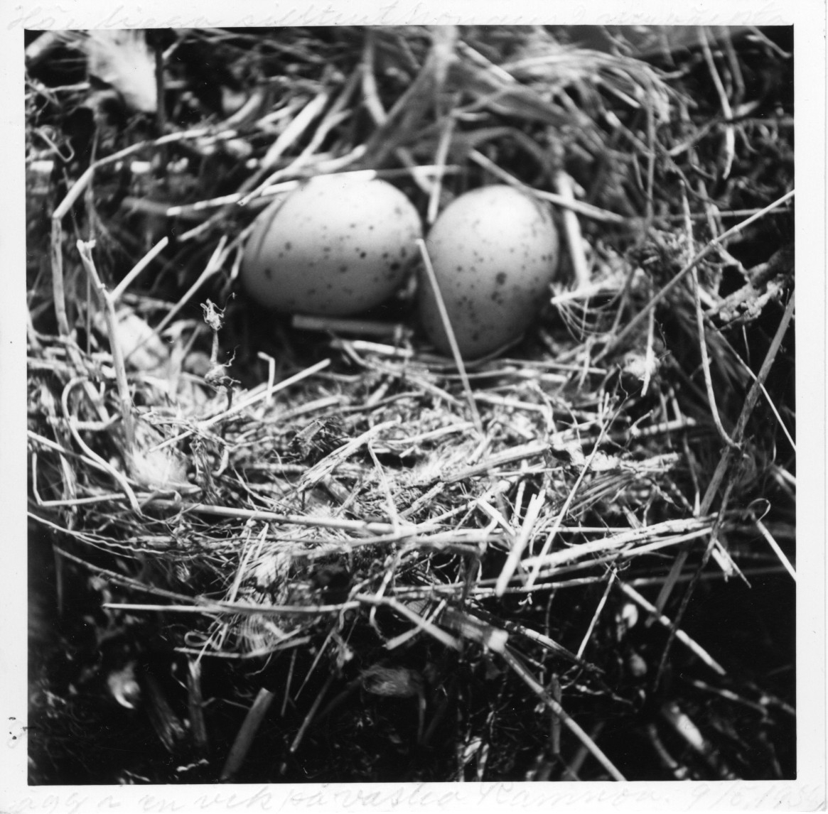 'Enligt anteckning på fotografiets baksida: :: ''Här ligga silltruthonans 2 nyvärpta ägg i en vik på västra Ramnön. Kolonien innehöll ett 50-tal par.'' :: :: Ingår i en serie med fotonr. 4512:1-57 med diverse foton av fågelbon med ägg och ungar. Varje fotografi har utförliga anteckningar på sin baksida, kopierade från framsidan, spår av de på framsidan är fortfarande synliga.'
