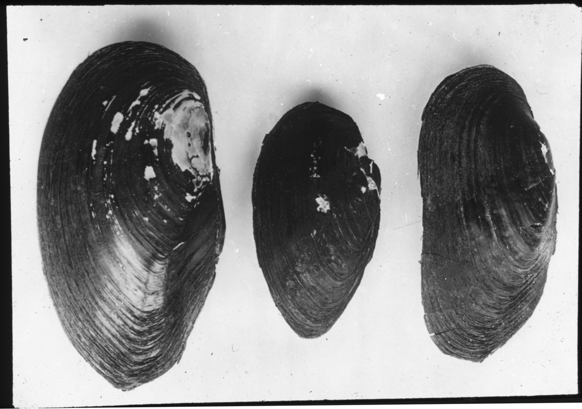 'Bildtext: ''Anodonta, Margaritifera (Margaritana) och Unio skal.'' 3 musselskal, ovansidan synlig. :: :: Ingår i serie med fotonr. 5120:1-8, se även fotonr. 5119:1-8.'