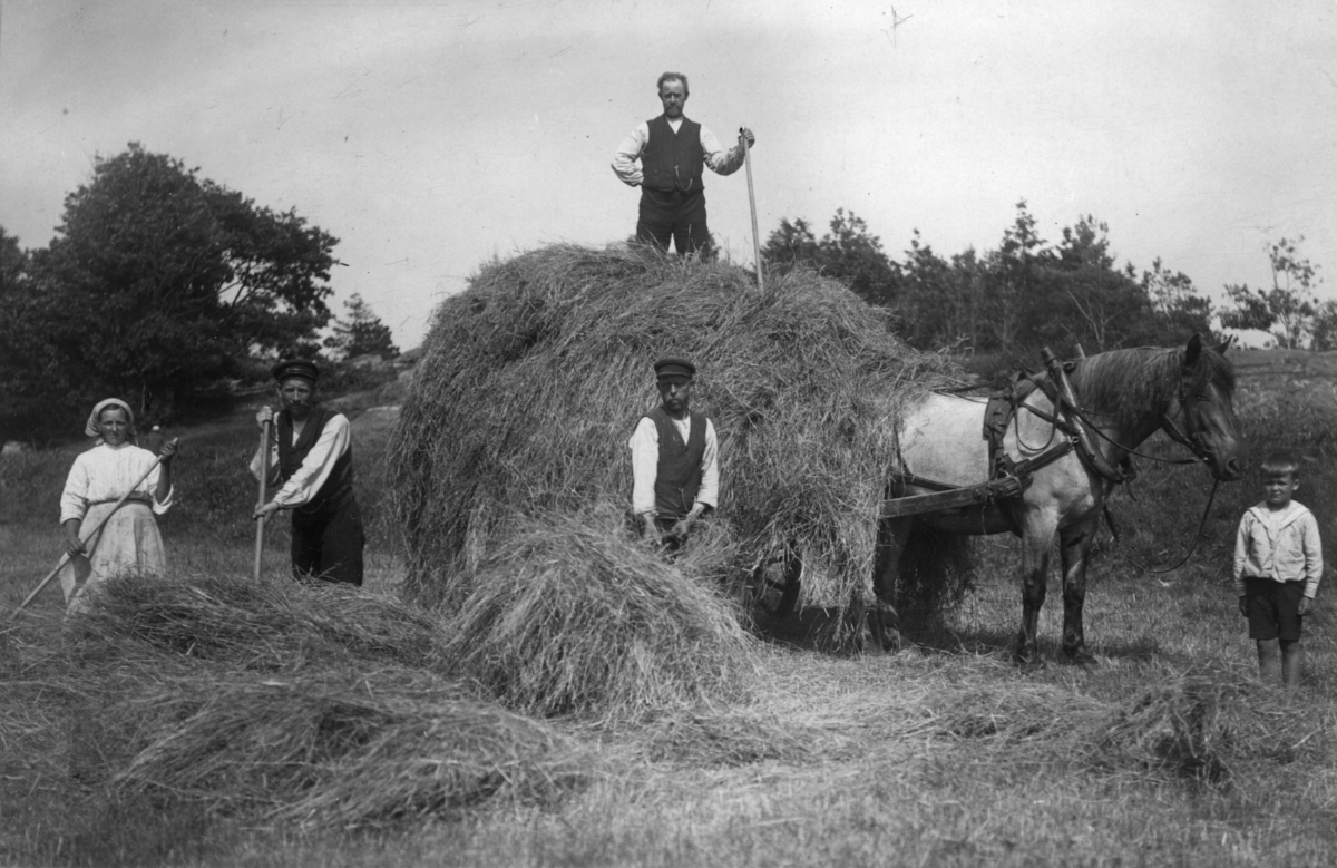 '1 kvinna, 3 män och 1 pojke vid hölass efter häst. I färd med att bärga hö.Text på kortet: ''Höbärgning med häst nedanför Bragebacken med parkens arbetarepersonal. P. f. Pettersson på hölasset, Hansson framför hölasset, Manda Lundström till vänster och Gustaf Pettersson till vänster.'
