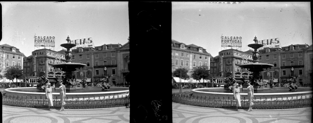 'Bildtext: ''''Drottningholms'' kryss till Södern: Fontänen, Praca Dom Pedro IV.'' :: :: 2 kvinnor iklädda hatt och kjil stående framför fontän med statyer. I bakgrunden hus, bilar, människor och spårvagn (eller buss). Skylt på hustak: ''Calcado Portugal''. :: :: Ingår i serie med fotonr 5266:1-16. Se även hela serien med fotonr. 5237-5267.'