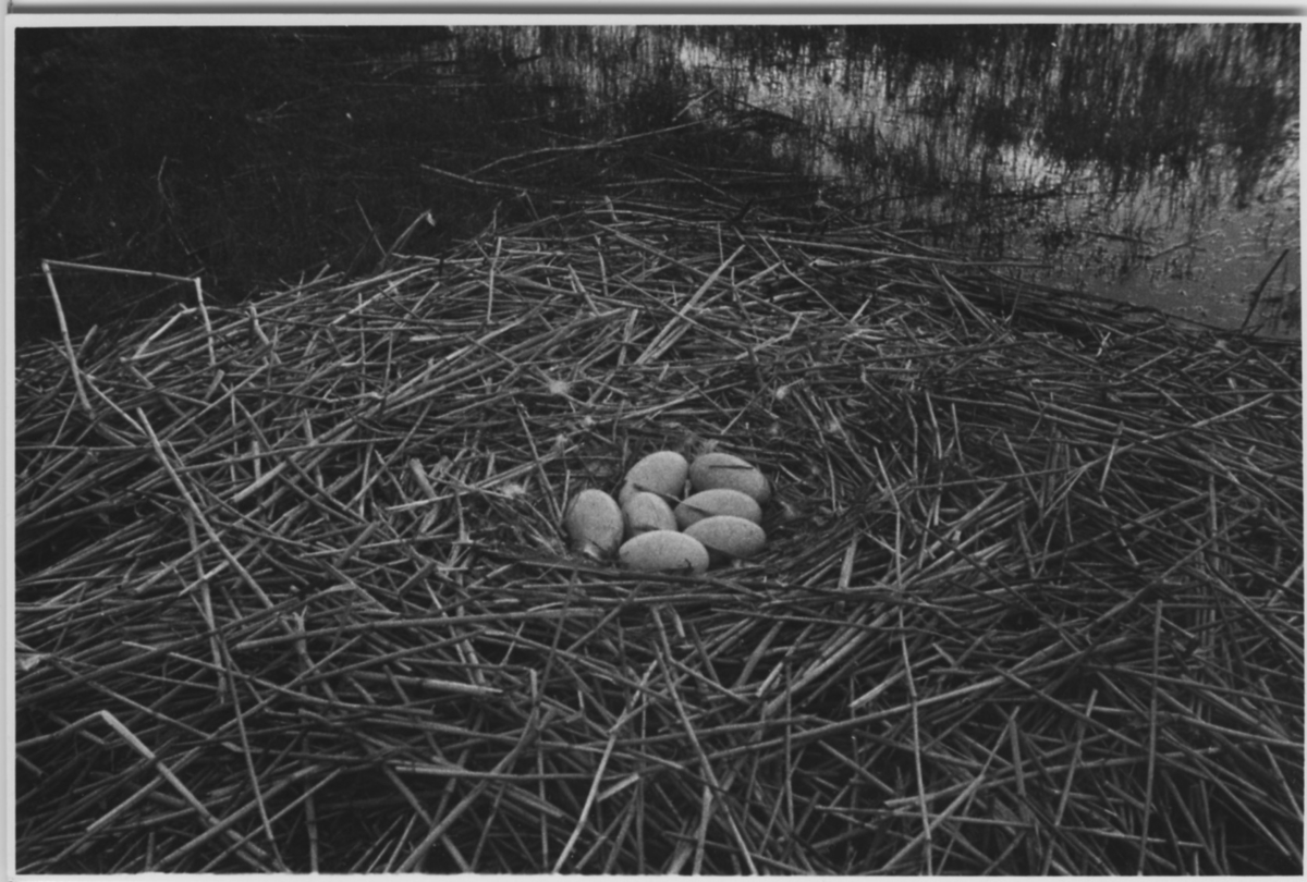 'Biologiska föreningens utfärd till Tåkern, Vadstena m.fl. platser: :: :: Svanbo av vass med 7 ägg i sjön. Närbild. :: :: Se fotonr. 3588-3634 samt 3661-3677.'