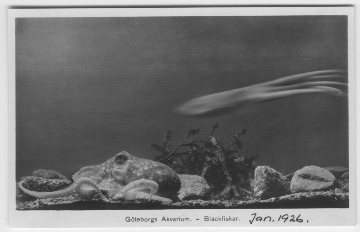'Bläckfiskar. 1 bläckfisk på botten och 1 simmande. :: :: Ingår i serie med fotonr. 1083-1089.'