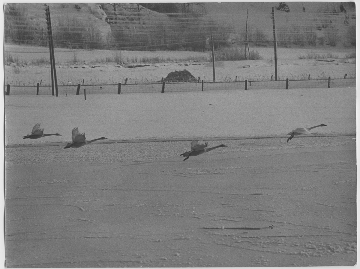 '4 svanar vid Bohus, flygande över isen. I fonden elledning och staket. :: :: Ingår i serie med fotonr. 1373-1379.'