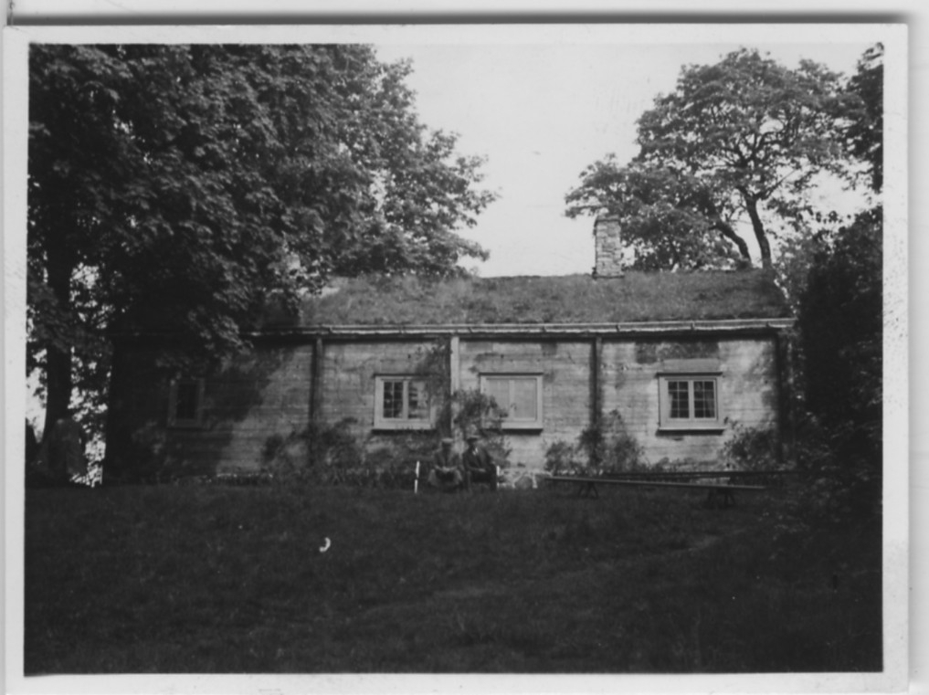 'Biologiska föreningens utfärd till Växjö, Aneboda och Misterhult: :: :: Linnés födelsehem, 2 män sitter framför huset. :: :: Se 3902-3908, 3909-3923 samt 3924-3933 från samma utfärd.'