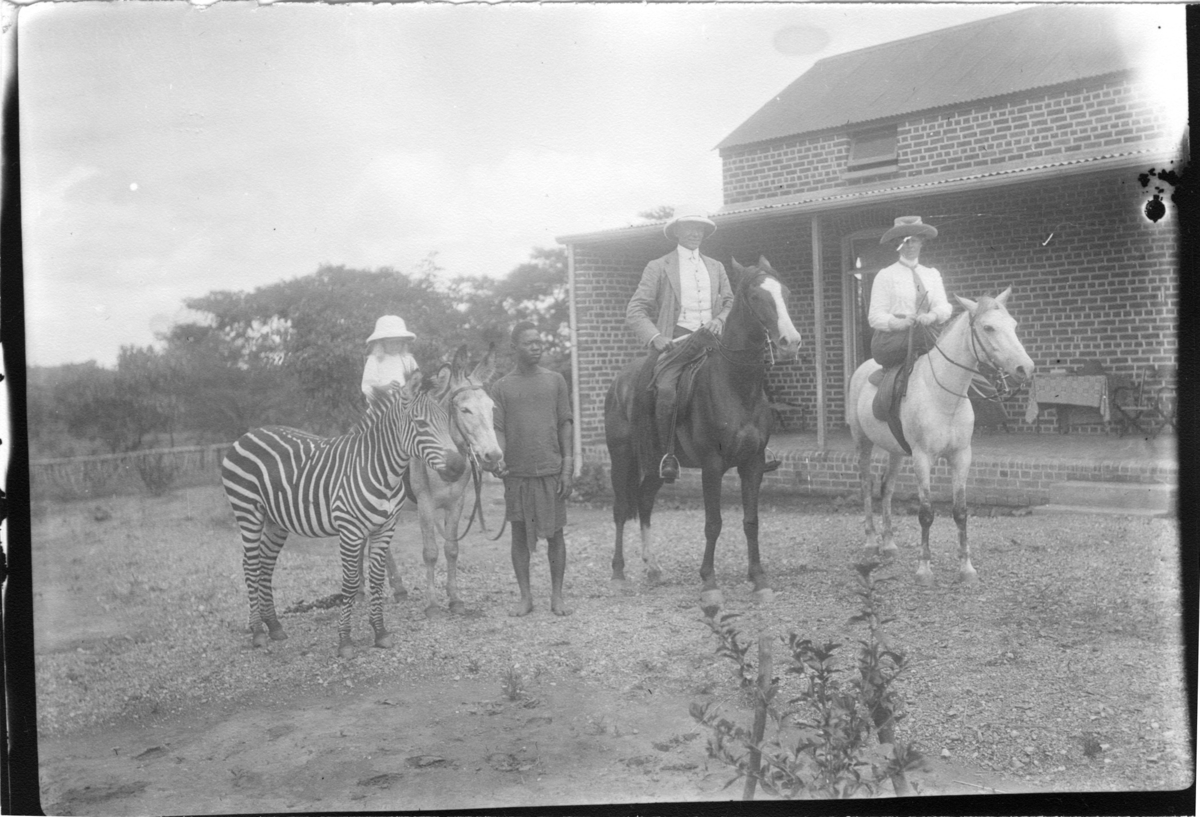 'Diverse fotografier från bl.a. dåvarande Nordrhodesia, nu Zambia, tagna av Konsul Magnus Leijer. :: :: 1 st man hållande åsna med 1 st flicka. Bredvid står en zebra. På andra sidan sitter 1 st kvinna och 1 st man på varsin häst. Samtliga framför en byggnad.'