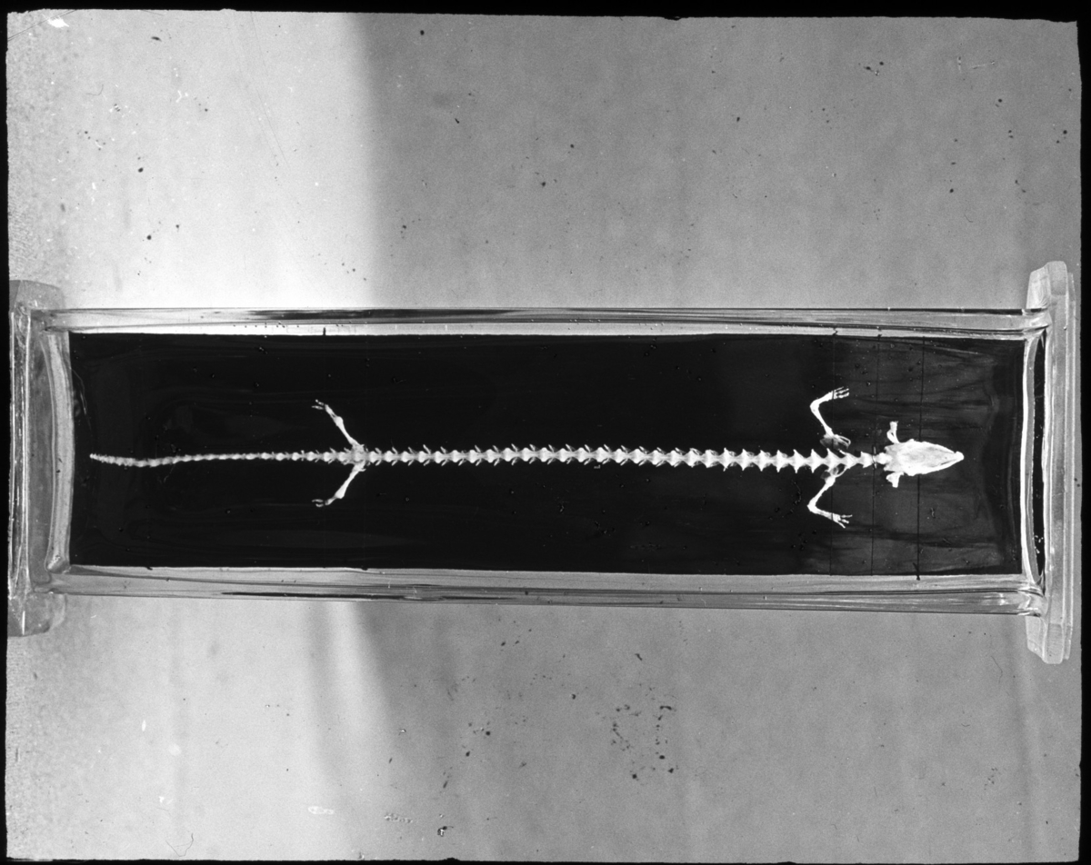 'Monterat skelett av en olm, sett från ovansidan. :: :: Från Dr. Schlüter & Mass, Halle a S naturvetens. Läromedel. Numrerad I.C. Nr. 10. :: :: Ingår i serie med fotonr. 5374:1-30. Se även hela fotoserien 5374-5376.'