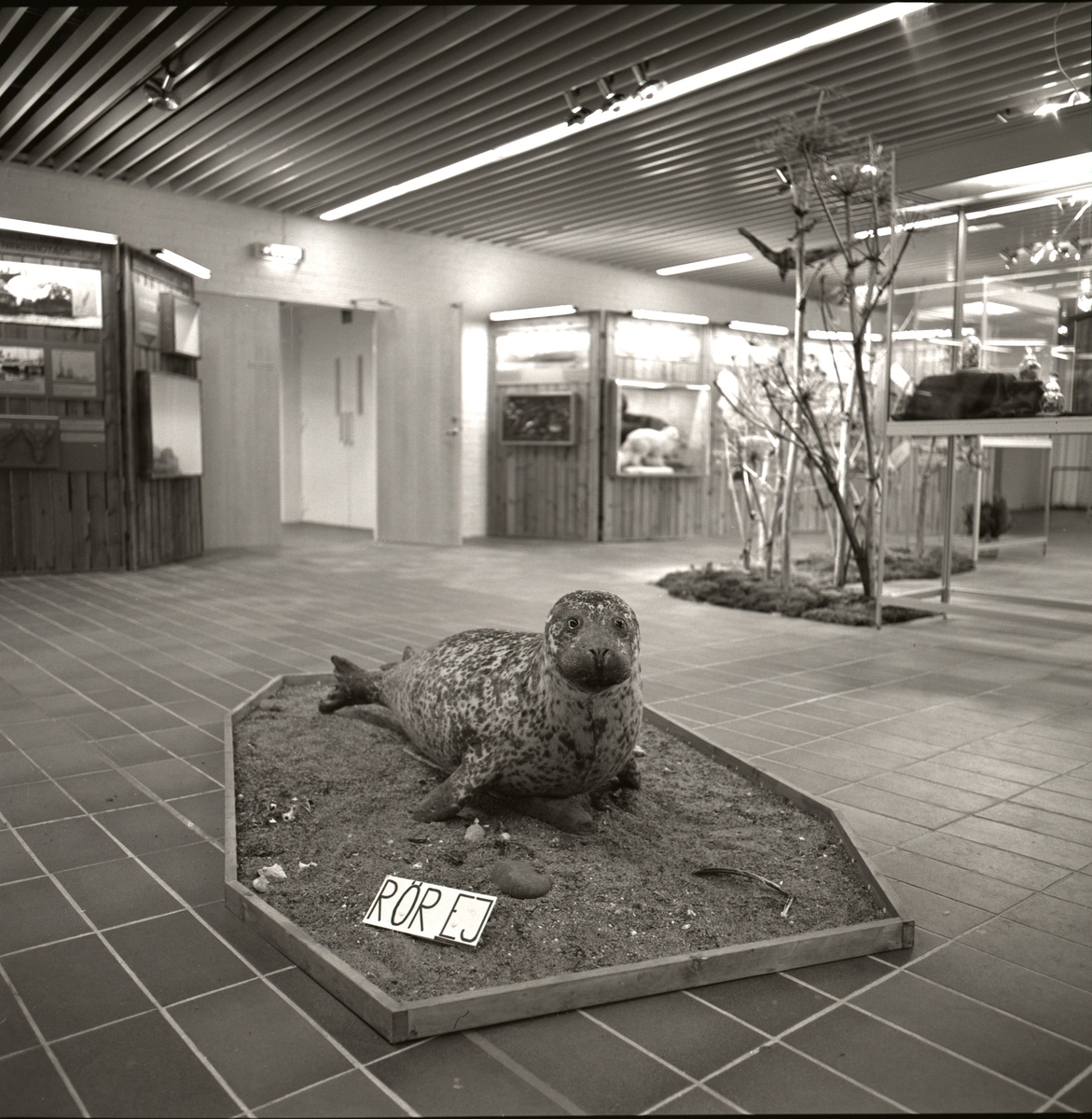 'Utställningen ''Blomsterprakt''. :: :: I förgrunden en monterad säl. Del av uställningen ''Blomsterprakt'' syns med torkade fröställningar. :: :: Ingår i serie med fotonr. 5797:1-7.'