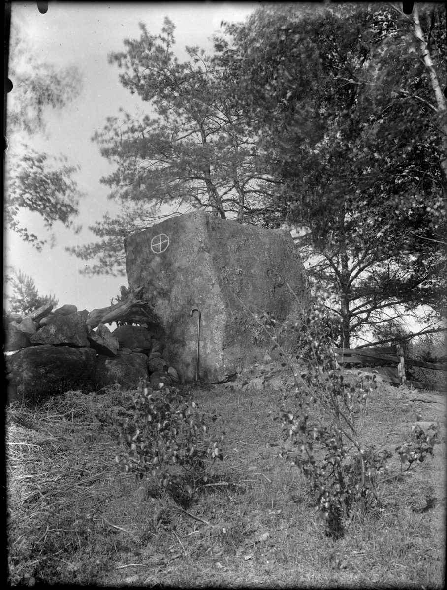 'Flyttblock, Djursten, på gränsen mellan Landvetter och Lindome socknar. :: Stort fyrkantigt stenblock med runt kryssmärke. En käpp står lutad mot blocket. Till vänster om blocket en hög med stenblock samt en omkullfallen trädstam med rotsystemet vilande upp mot blocket.'