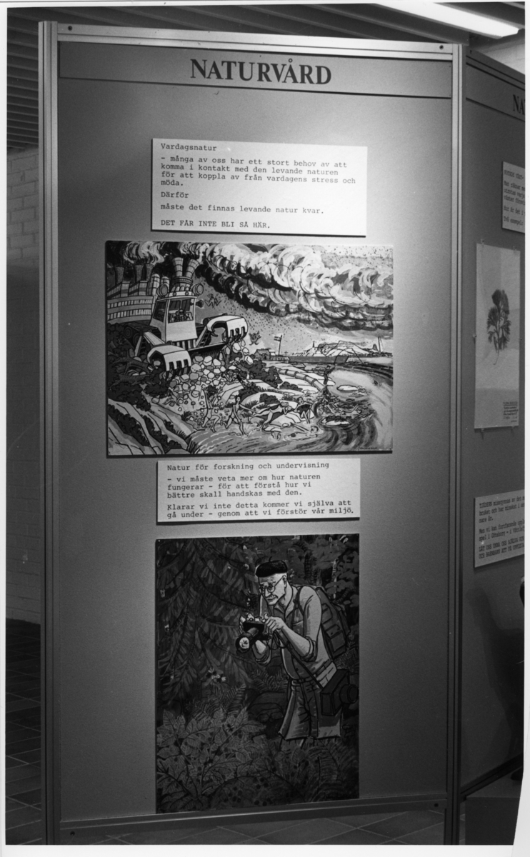 'Foto på Jubileumsutställningen, Göteborgs Naturhistoriska museum 150 år. :: :: Utställningsskärm angående naturvård, med text och teckande bilder.'