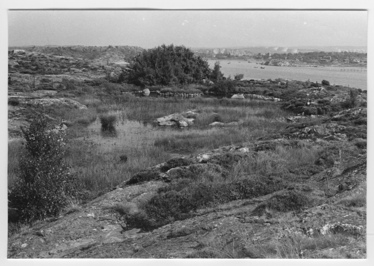 'Bildtext: ''Klippbäcken. Vattenfyllt, delvis igenväxt. Riktning 50.'' Vy med klippbäcken med en liten träddunge. I fonden havet och hus och brygga. :: :: Ingår i serie med fotonr. 6970:1-1125, dokumentation av Hisingens naturgeografi, visande landskapsformerna i stora drag och gjord inför exploateringen av området. Platserna för fotograferingen finns utsatta på karta i skala 1:4000 som finns på Göteborgs Naturhistoriska musem. Fotoriktningen mättes med kompass i gammalgrader.'