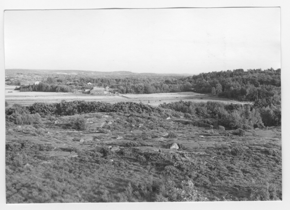 'Bildtext: ''Hällparti med stora block. Sedimentyta. Riktning 140.'' :: Vy över berghäll med spridda stenblock. Vy med träd och buskbevuxna berghällar med en öppen yta nedanför, öppna fält, betande boskap. :: :: Ingår i serie med fotonr. 6970:1-1125, dokumentation av Hisingens naturgeografi, visande landskapsformerna i stora drag och gjord inför exploateringen av området. Platserna för fotograferingen finns utsatta på karta i skala 1:4000 som finns på Göteborgs Naturhistoriska musem. Fotoriktningen mättes med kompass i gammalgrader.'