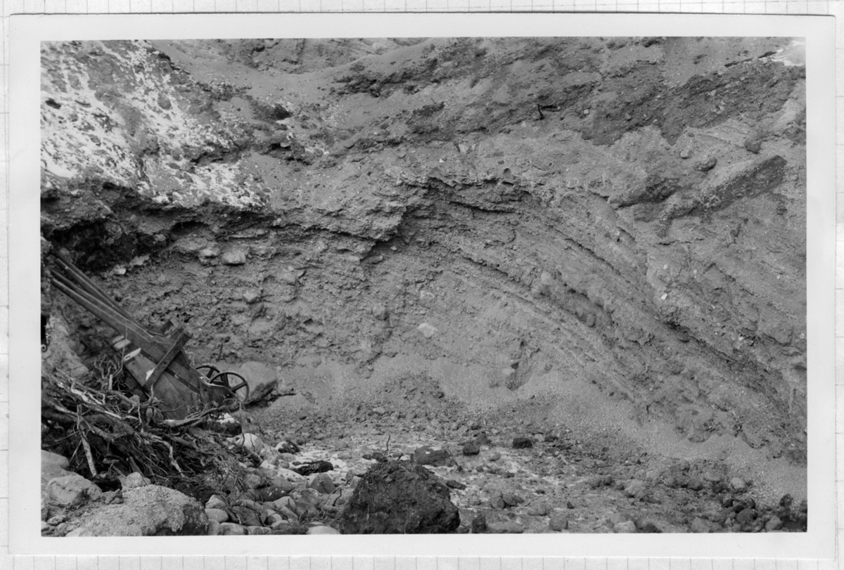 'Grustaget, träkärra liggande mot grusväggen. :: Text till bilden:Renhornsfyndet vid Frändetorp. Grustagets bakre vägg.'' :: :: Ingår i serie med fotonr. 6996:1-3, bilder som finns i arkivhandling nr 828 på Göteborgs Naturhistoriska museum. :: :: Se även fotonr. 2667 och 4476.'