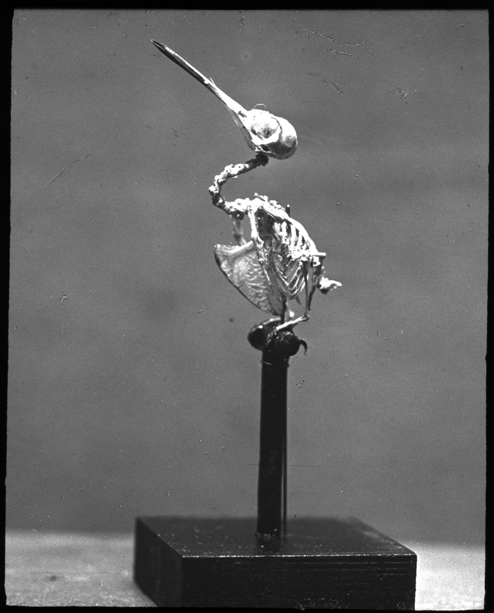 'Monterat skelett av Thalurania columbica sett :: :: Från Dr. Schlüter & Mass, Halle a S naturvetens. Läromedel. Numrerad I.B. Nr. 4. :: :: Ingår i serie med fotonr. 5374:1-30. Se även hela fotoserien 5374-5376.'