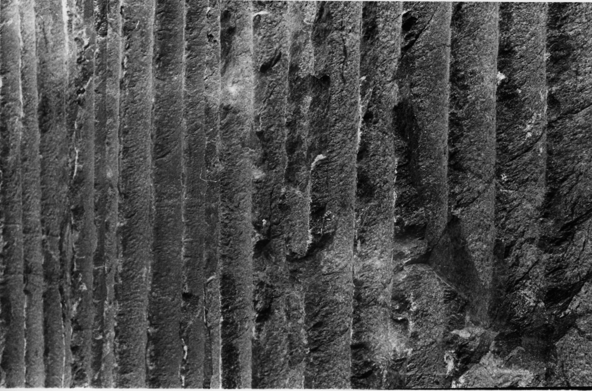 'Tillbyggnaden av Göteborgs Naturhistoriska Museum februari 1979. Södra ytterväggen Göteborgs Naturhistoriska Museum, bergvägg efter sprängning. Närbild av bergväggens struktur efter sprängningen. Sprängd så att fina lodräta räfflor bildats. :: :: Ingår i serie med fotonr. 5527:69-216.'