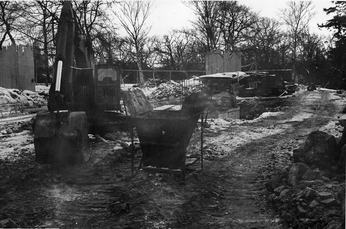 'Tillbyggnaden av Göteborgs Naturhistoriska Museum februari 1979. Byggarbetsplatsen. Grävmaskin :: :: Ingår i serie med fotonr. 5527:69-216.'