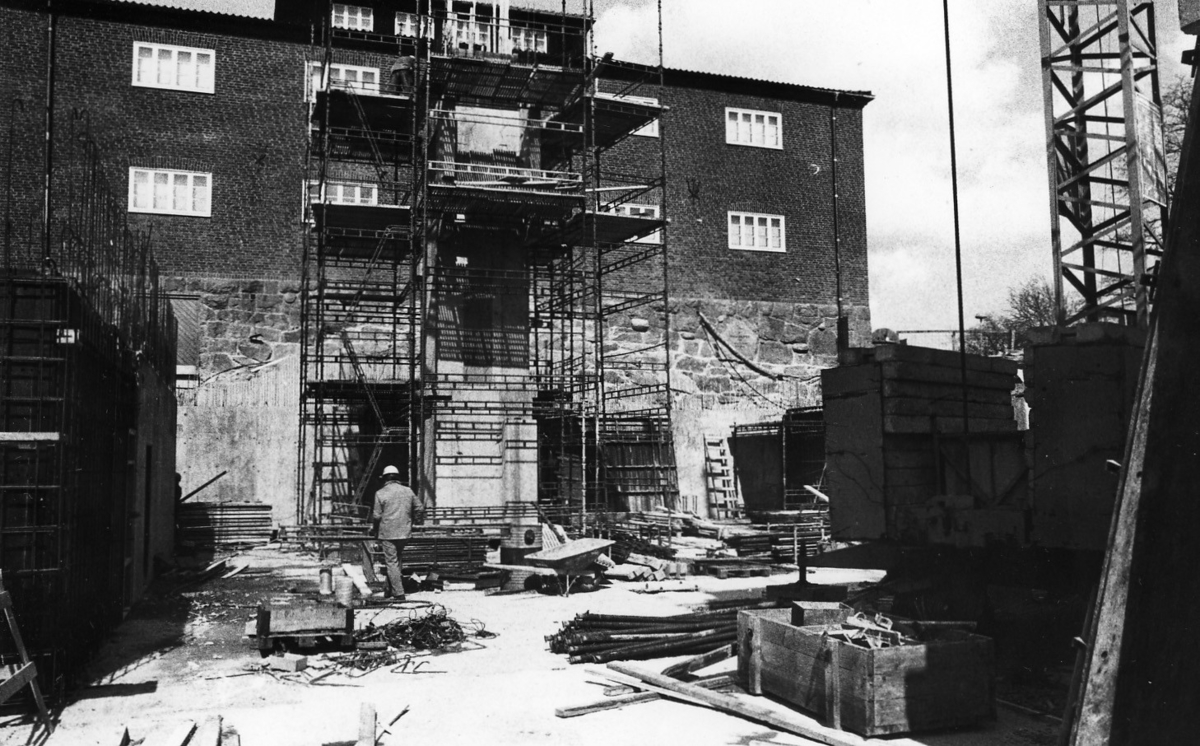 'Tillbyggnaden av Göteborgs Naturhistoriska Museum maj 1979. Södra ytterväggen Göteborgs Naturhistoriska Museum. Byggnadsställning, byggnadsarbetare :: :: Ingår i serie med fotonr. 5527:69-216.'
